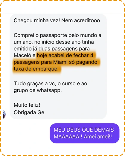 Outras alunas ja estão viajando com milhas com um gasto médio mensal de R$3.000,00 e emitindo com milhas o que você paga em reais.